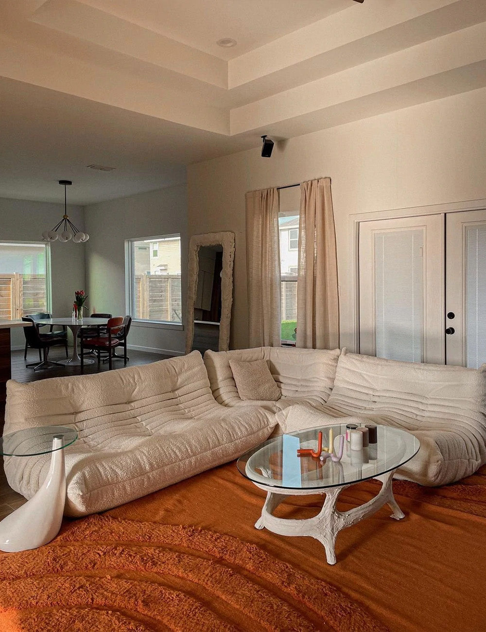 The drama of it all. Neutral statement pieces combine with a pop of color, textural materials, and retro feels make this living room a show-stopper.