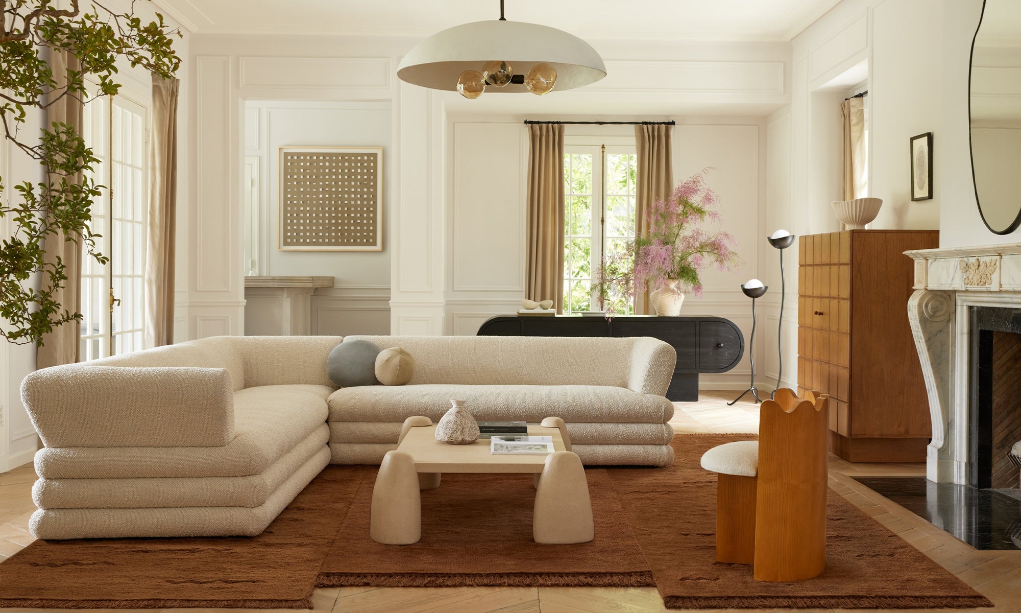 An irregular shaped rug combines with sculptural furniture for a living room that has wow-factor.