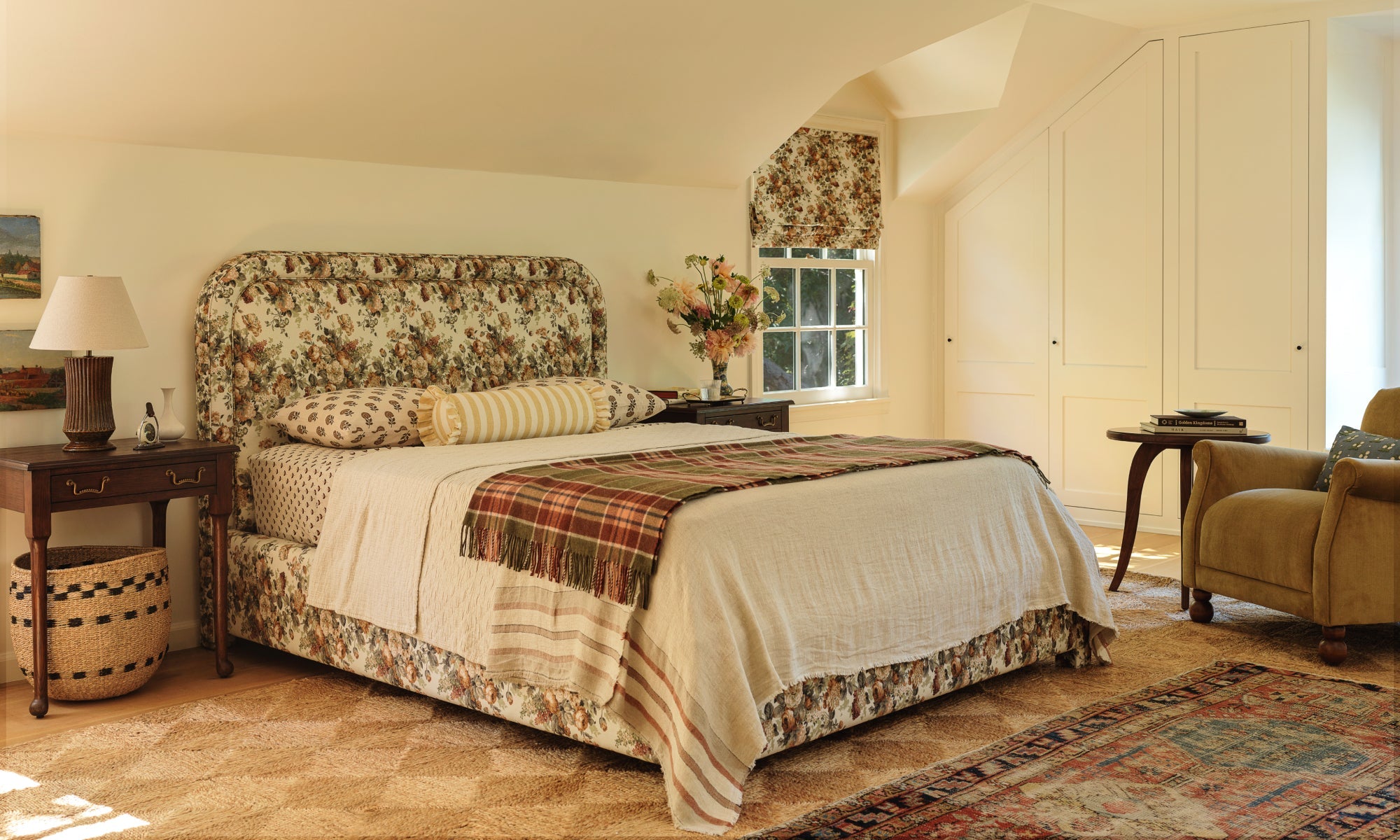 Bold pattern and traditional forms give this bedroom vintage-inspired charm.