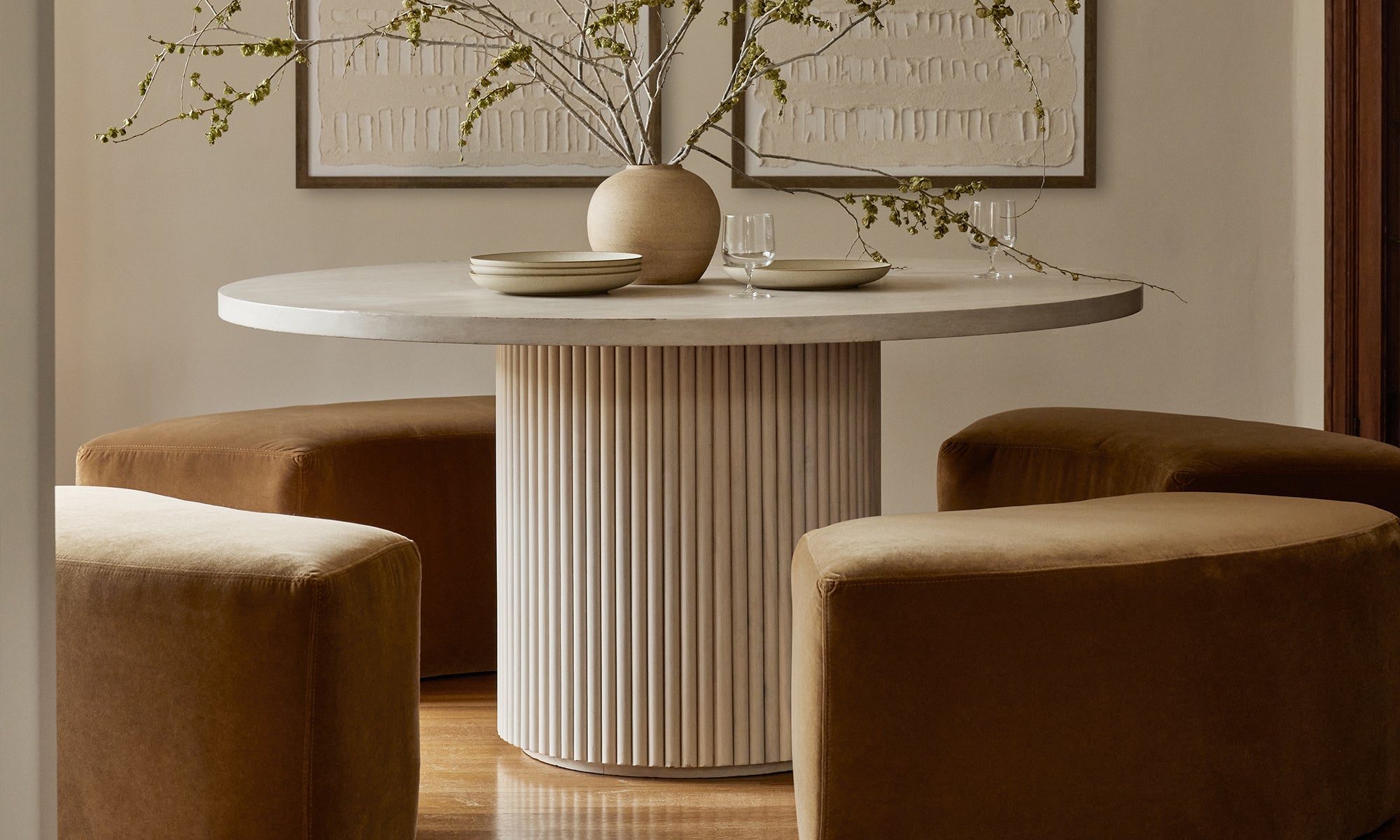 Elevate a dining nook with rich velvet seating, large artwork, and a show-stopping table.