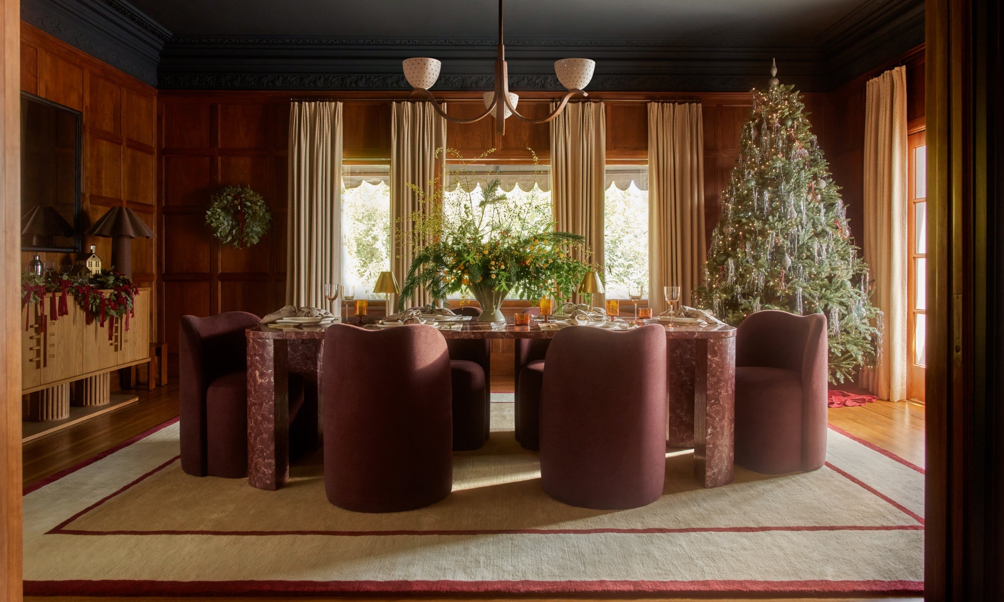 A moody palette and sumptuous textures bring sultry glamour to this dining space, layered with festive florals and dramatic lighting.