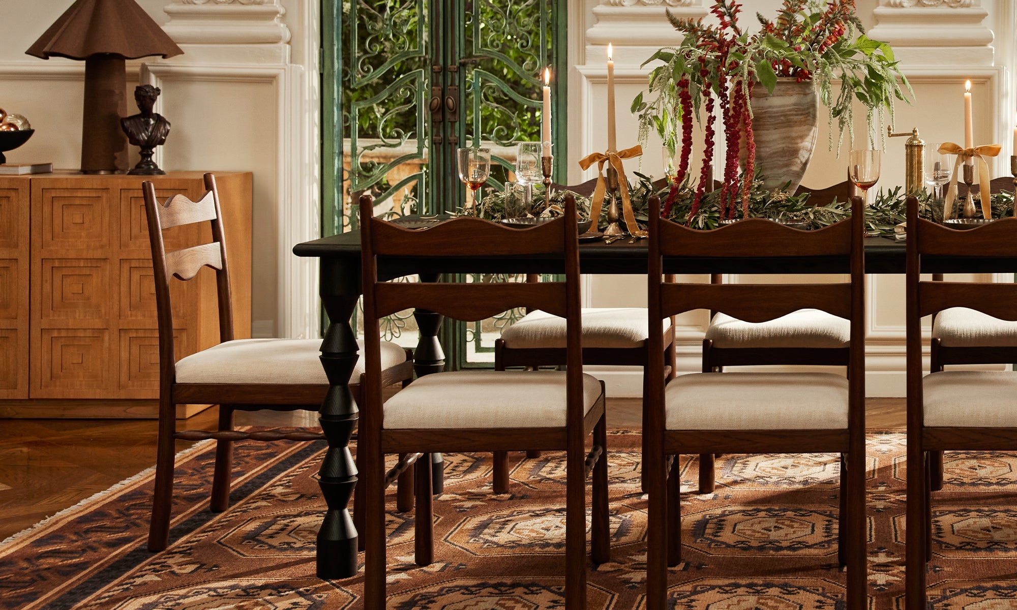 Dark finishes and whimsical lines underpin this room as touches of brass and glass gleam among plenty of fresh leafy texture—the patterned rug underfoot brings it all together.