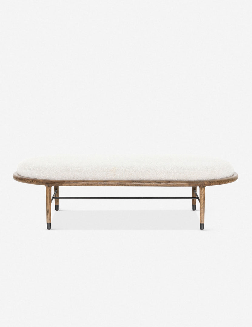 This bench blends understated style with function, with its oval-shaped upholstered seat being roomy enough to provide an extra surface when you pair it with a tray. In inviting cream, this bench's textural boucle upholstery is woven into a sculpted oak base and then finished with gunmetal-finished iron stretchers and ferrule caps for a fresh finishing touch.
