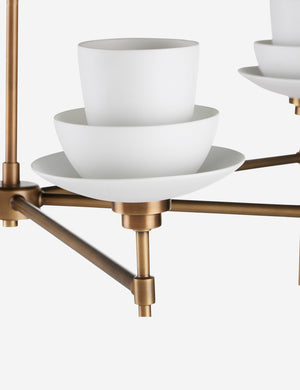 Bone china shades bring a warm, translucent effect to the Alouette chandelier. An antique brass finish highlights the telescoping arms, adding polish to this timeless chandelier design.