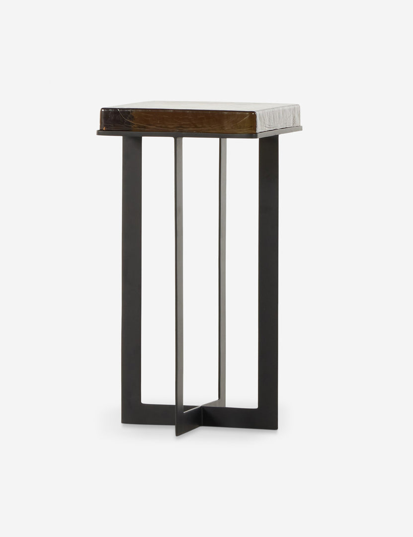 Hand-cast recycled amber glass creates a distinctive block top in this refined side table. An intriguing accent in your den or living room, it emphasizes warmth and character with a cradle-style base in black for an end table that can tuck into your design with standout appeal.