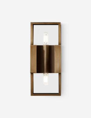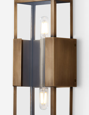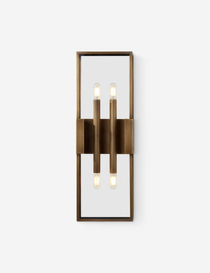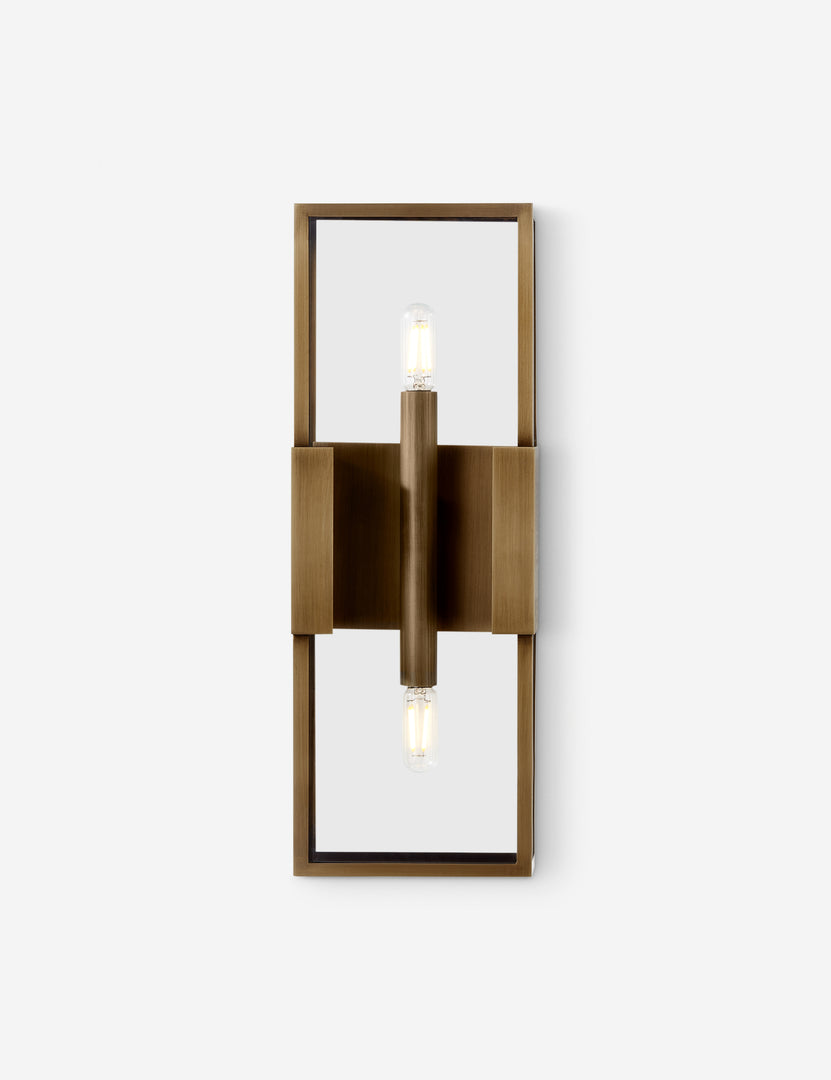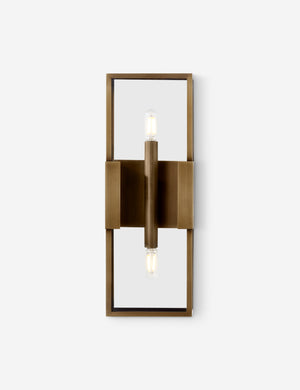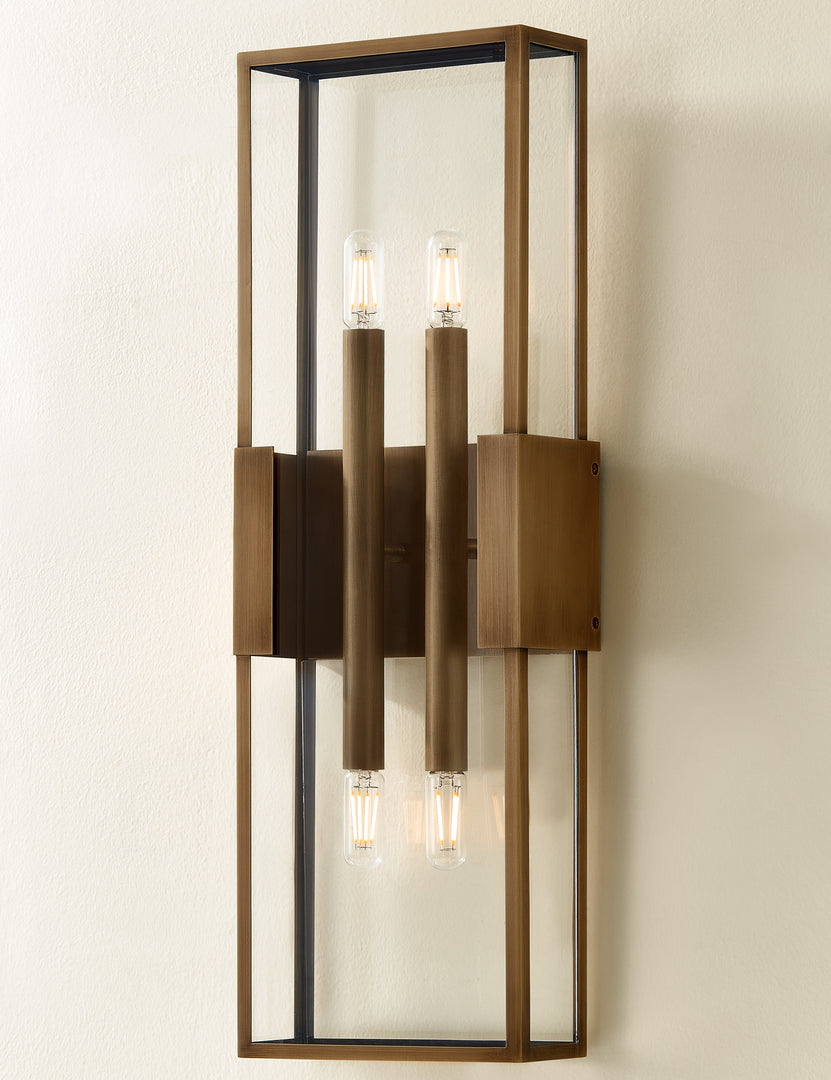 A modern sconce light, thoroughly refined. The linear frame offers a minimalist take on the candle box sconce, with clear glass panels and a burnished brass finish for a subtle touch of patina. We love the transitional appeal of this indoor / outdoor sconce for a styling timeless reception at your front door.