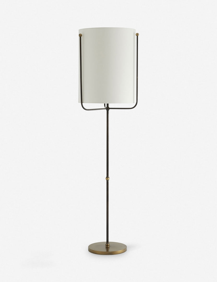 This lamp's all about opposing design elements. Delicate lines and a simple shade juxtapose with industrial iron and antique brass finials, providing a contrast of shapes and finishes that stands out in a traditional space.