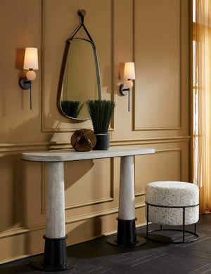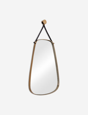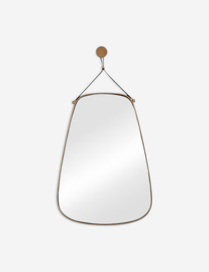 Rounded edges soften the aspect of this playfully geometric mirror. The thick antique brass frame is suspended from a black leather strap for a touch of western-industrial style. We love this hanging wall mirror for a casual yet elevated look in a bedroom or powder room.