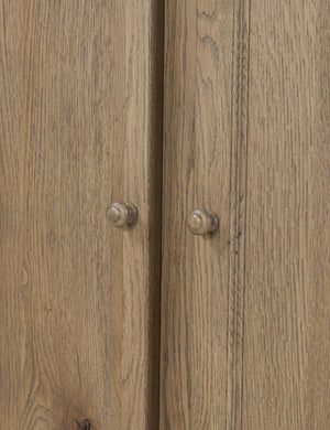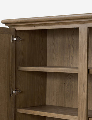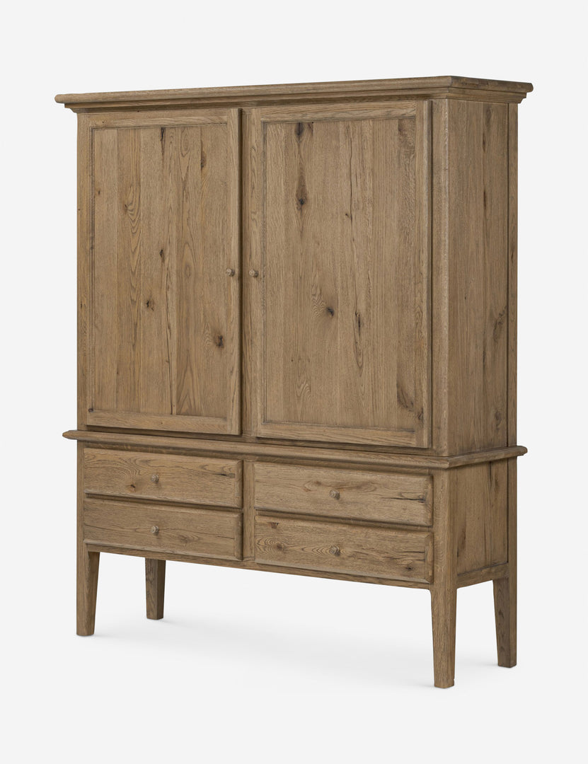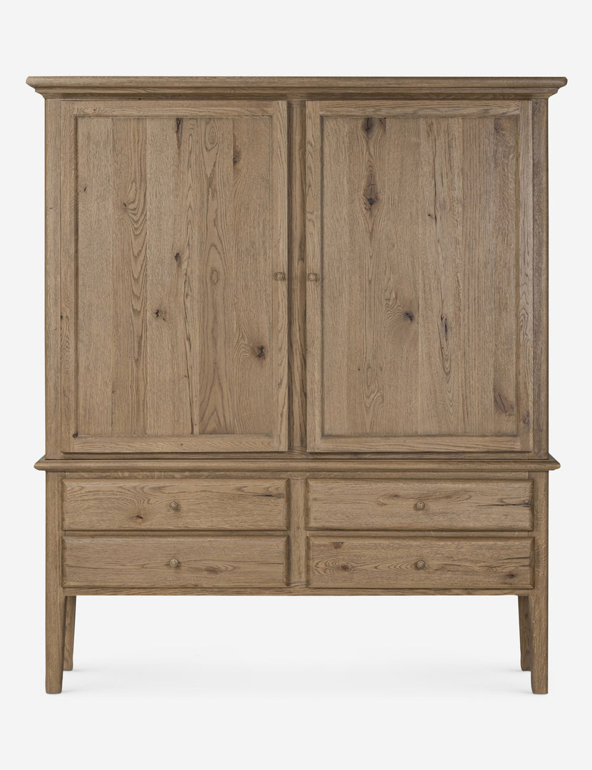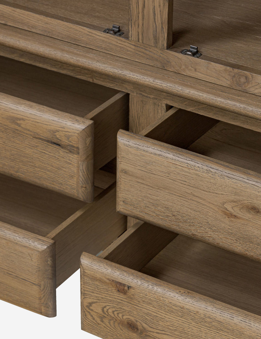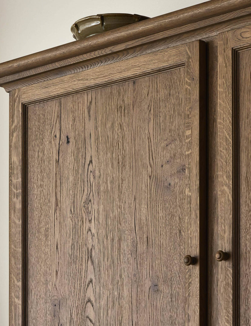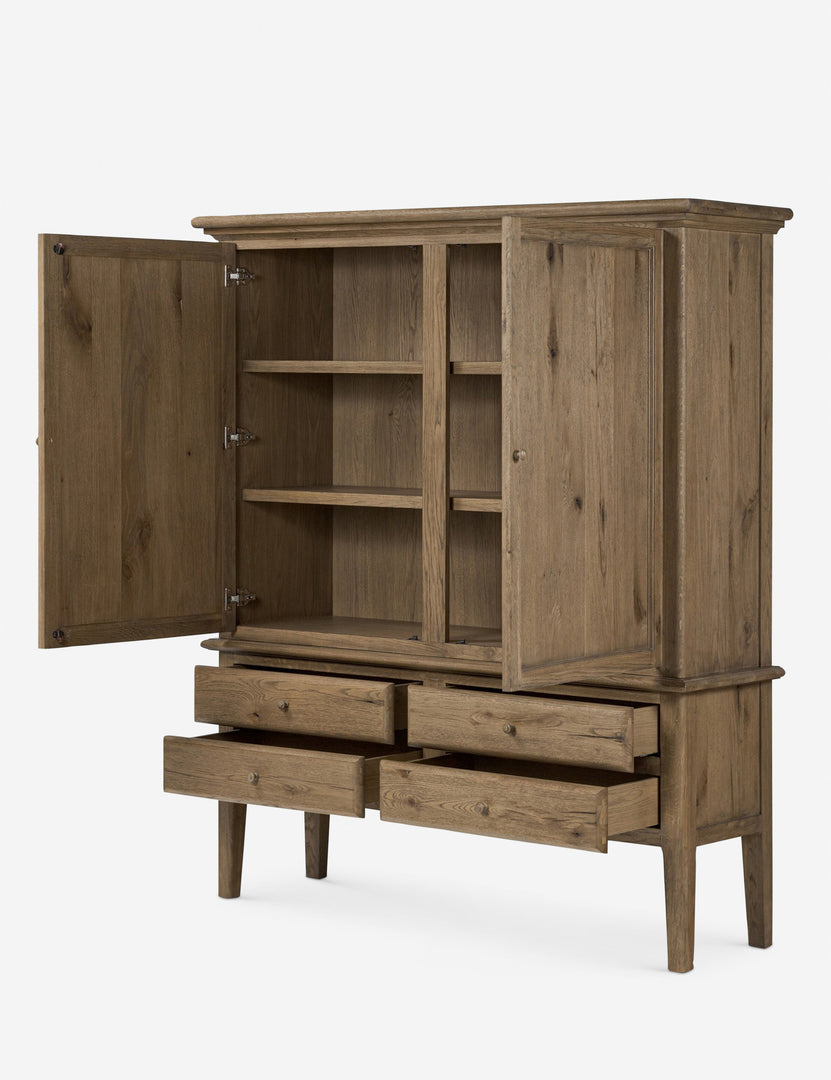 With its worn oak grain and intricate woodwork, the Ashcroft cabinet brings a timeless, collected look to your space. Behind its antique-inspired aesthetic, roomy shelving and four lower drawers offer practical storage. We love how it blends classic character with modern function for a curated, lived-in feel.