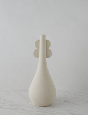 Decorative accent handles add a touch of whimsy to the dramatic curvature of this modern vase. A perfect choice for a side table or buffet, its neutral tone and artisan construction create a rich interplay of texture and color that's an elevating addition to any setting.