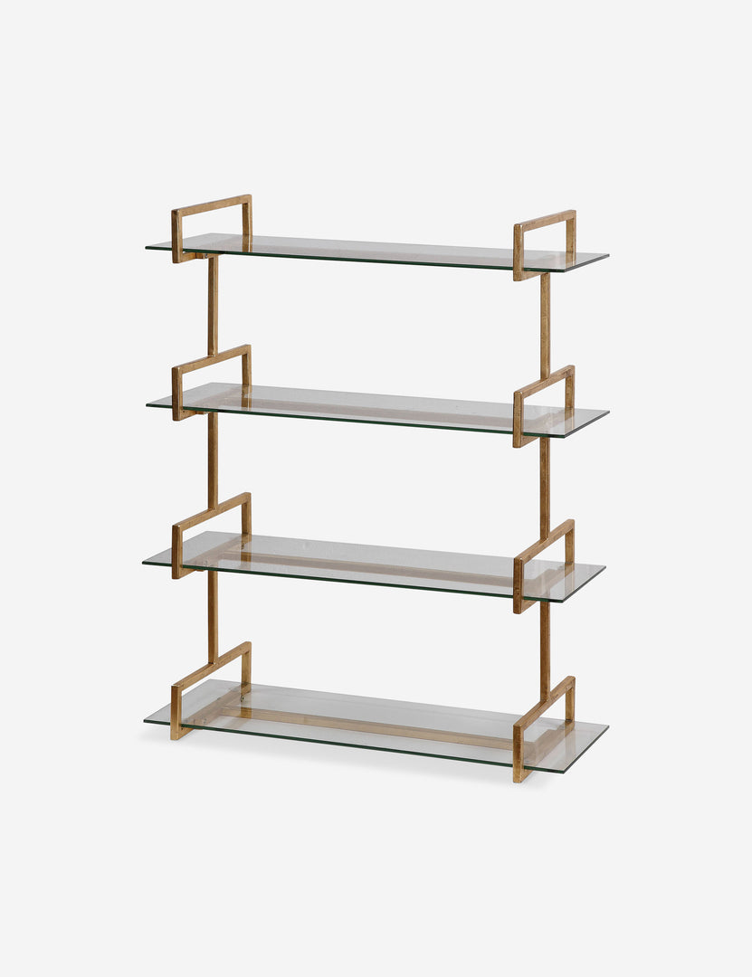 Floating glass shelves sit in a robust geometric frame to create a chic place for storage and display. This shelf brings a modern edge with a touch of warmth with its iron construction and antiqued gold leaf finish. Add favorite pieces, new and old, to create a truly personalized moment in your wall decor.