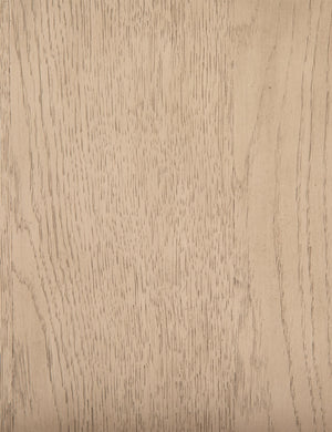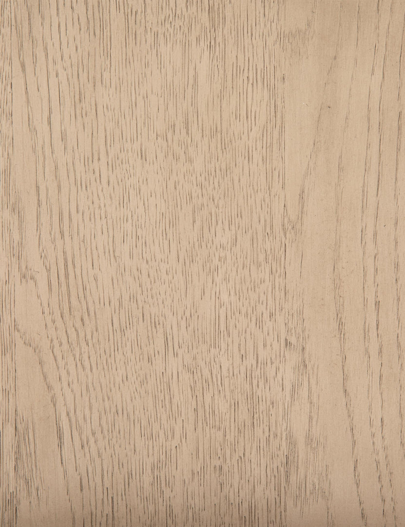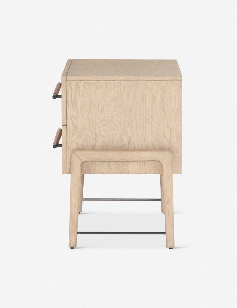 With its clean lines, sandy finish, and leather accents, this nightstand brings a refined, minimalist effect to your bedroom. Constructed from solid oak and an oak veneer, it's complemented by iron hardware and wrapped in tan top-grain leather. Two roomy drawers provide a bit of extra storage space.