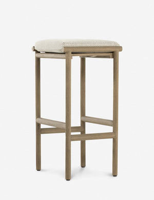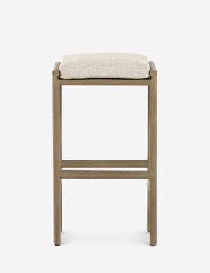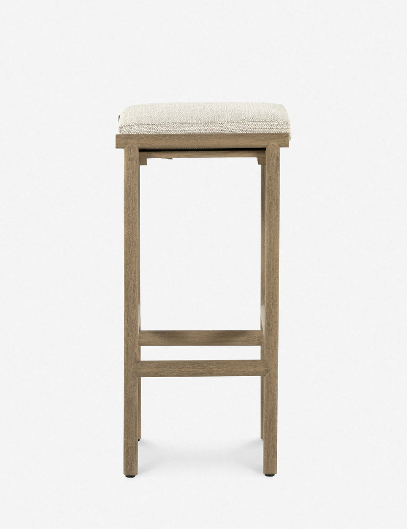 This bar stool offers a dynamic, flexible seating option with a solid teak frame and removable cushion, upholstered in a performance fabric designed to hold up against the elements. Perfect for a poolside bar or styled with a textural outdoor rug, this stool helps to create a laid-back transitional space filled with coastal undertones.