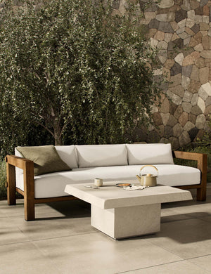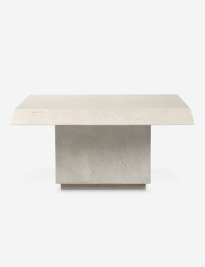 Four Hands brings their exceptional craftsmanship to a timeless collection rooted in Amber Lewis' perennial California style. Aged white concrete and diagonal cuts create a robust but airy pairing on a modern indoor / outdoor coffee table. It’s a square design with a wide pedestal base — the perfect new coffee table for snacks and beverages on a warm summer afternoon.