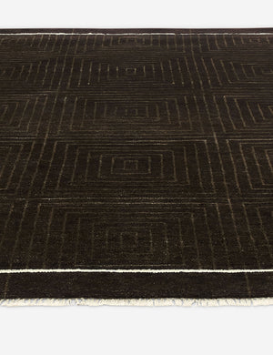 Grounded in a rich chocolate hue, the Barcelona rug pairs geometric patterning with a bold framed border. Meticulously hand-knotted from wool, the design layers texture and detail into a timeless motif. This dark wool rug makes a striking foundation for living rooms, dining spaces, or bedroom curations.