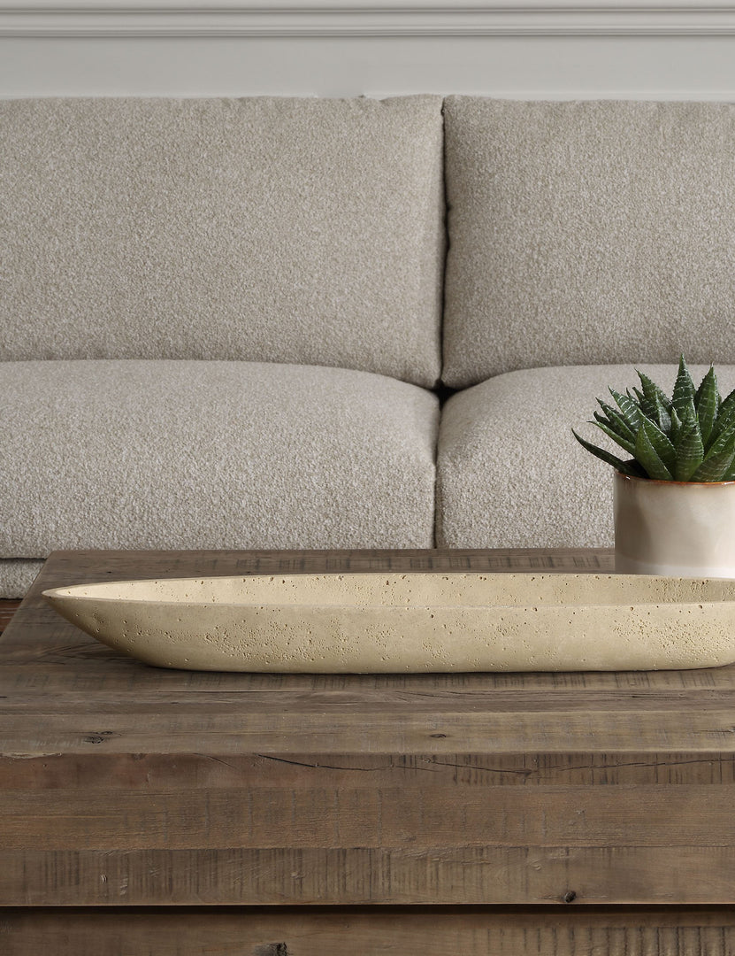 A long, shallow silhouette and subtly textured finish give this travertine-like bowl an understated elegance. Style it on a console or dining table to ground your curation with a sleek form.
