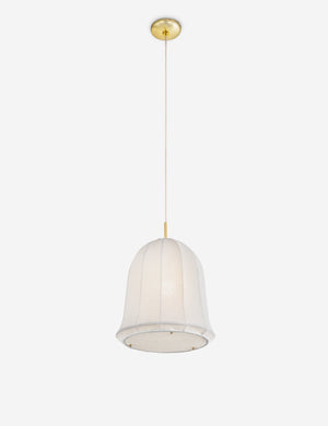 Brasov folds neoclassical notes into a modern pendant design. The scalloped, arching form is softened by woven cotton stretched over a light metal frame, creating a glow that feels airy yet structured. Mount this ceiling light overhead to bring understated grandeur to a dining or lounge space.