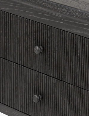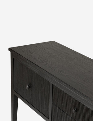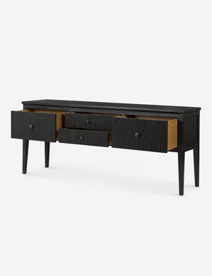 Four Hands brings their exceptional craftsmanship to a timeless collection rooted in Amber Lewis' perennial California style. Reeded details bring engaging style to a classic console table with four drawers. The large outer drawers and compact center drawers add visual interest, while tapering legs create the perfect finishing touch for a sofa table with easy storage.