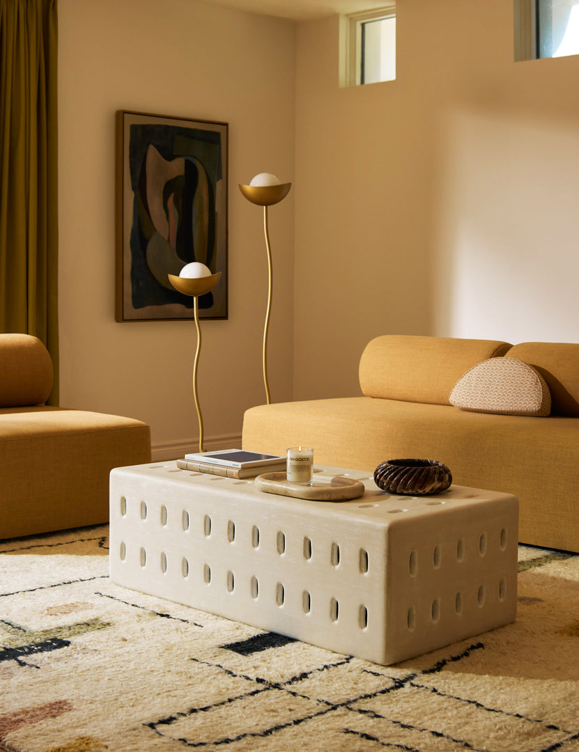 The blocky silhouette of this concrete coffee table balances organic design with an industrial edge for a striking conversational space indoors or out. The slotted holes add a sculptural dimension perfect for fresh-air settings. We recommend styling our Cabra coffee table in a shaded or covered area.
