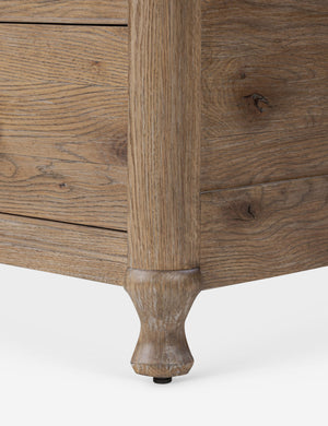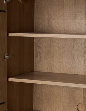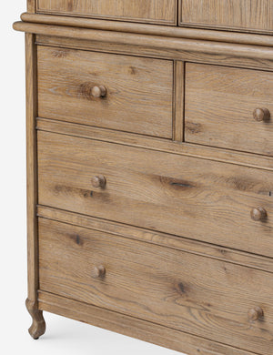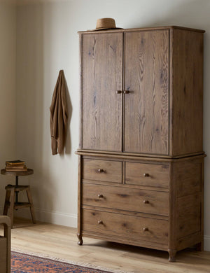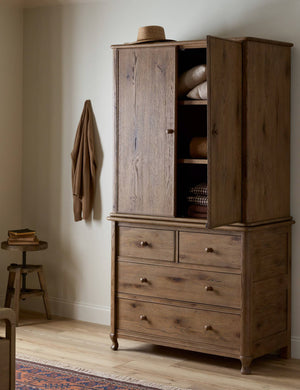 The Caraway cabinet brings heirloom style to functional storage. Crafted from heavy weathered oak with turned wood hardware, the design features decorative feet and beading around the drawers and doors. With adjustable shelves and a removable hanging rod, this armoire cabinet is a timeless storage piece for linens, clothes, or household essentials.