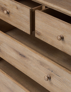 The Caraway dresser brings heirloom style to bedroom storage. Crafted from heavy weathered oak with turned wood hardware, the design features decorative feet and beading around the drawers and doors. Style this small dresser as a bedroom staple or ground a guest space with natural grain warmth.