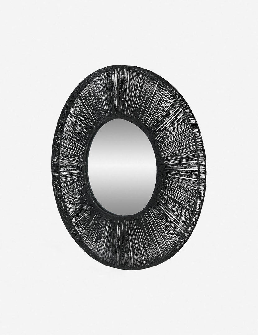 This round framed mirror is a statement-making accent, combining organic appeal with a sleek black color. Twisted jute fibers are tightly woven around a light steel frame to create a textural finish. Hang this round wall mirror above a sideboard, console table, or dresser in a dark finish for a monochromatic look.