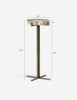 A beautiful slice of petrified wood brings a rich, organic feel to this modern side table. Its cocktail-style silhouette is tall with a round top, while its brass base adds textural character. Add this end table to a pair of armchairs for a refined presentation.
