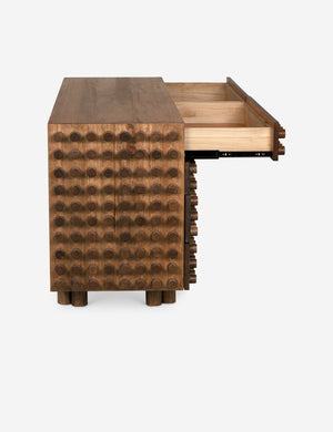 Clean-lined yet texture-forward, the Cavelti sideboard strikes an elegant balance between minimalism and warmth. Walnut veneer in a dark finish provides a grounded tone for its crisp silhouette and expansive interior. Style this sideboard cabinet in a dining space or open-plan living area for functional storage with statement appeal.