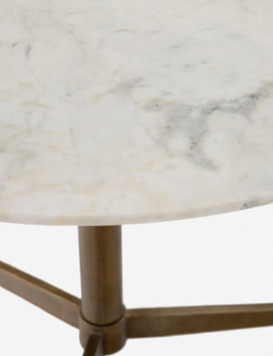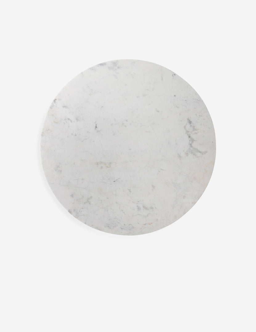 Add a touch of drama and Art Deco-inspired style with this marble-topped dining room table. A slim aluminum tripod base, in an antiqued raw brass finish, supports a roomy, rounded tabletop of polished white marble. This bistro table is perfect for breakfast nooks or smaller-scale dining rooms.