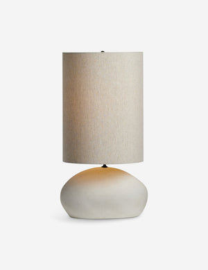 Soft lines and subtle textures ground this ceramic table lamp with quiet impact. Light fills the tall shade with a luminous glow and pours over the low, sloping base when lit. The elongated design offers a sculptural touch to add dimension and gently elevate any tabletop curation.