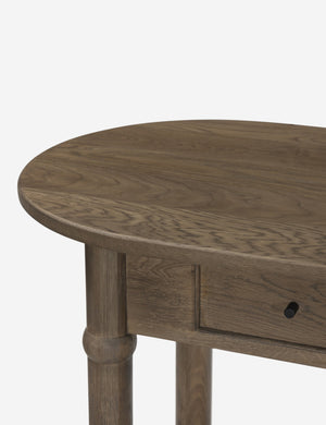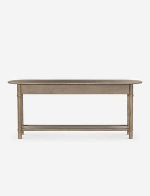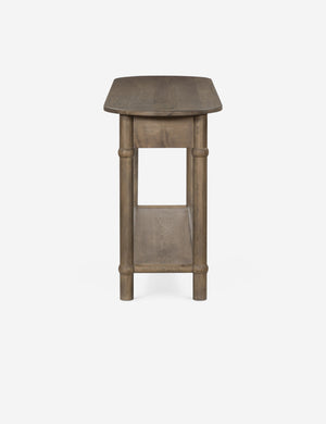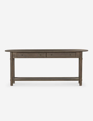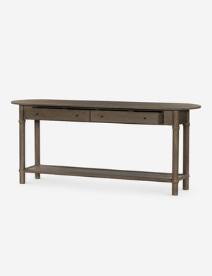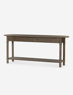Four Hands brings their exceptional craftsmanship to a timeless collection rooted in Amber Lewis' perennial California style. The Charnes console table blends vintage and modern influences with its oval top, softly curved edges, and warm finish. Two drawers and a low shelf offer ample space for storage and decor, whether styled as a living room or entryway table.