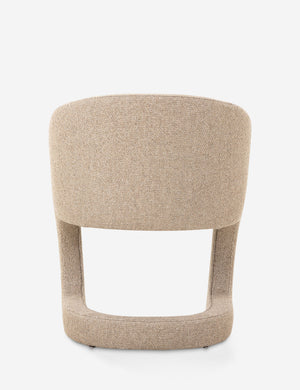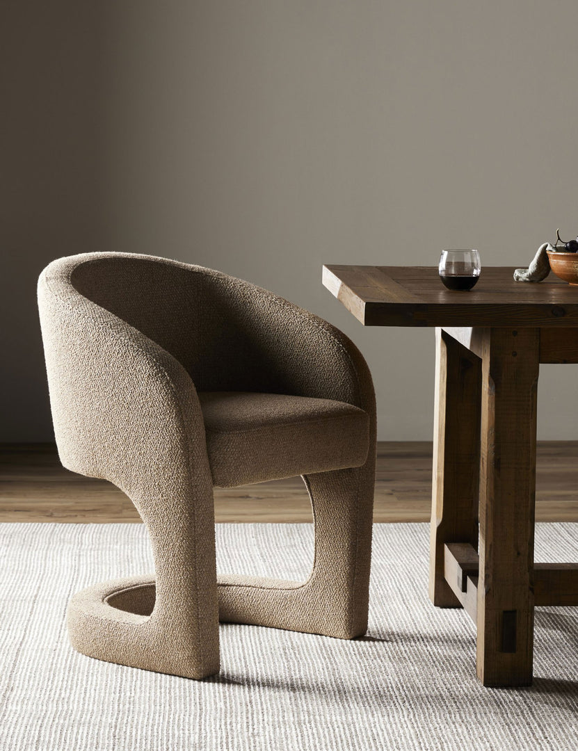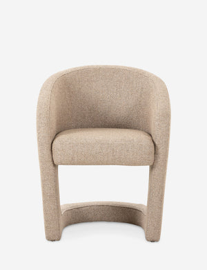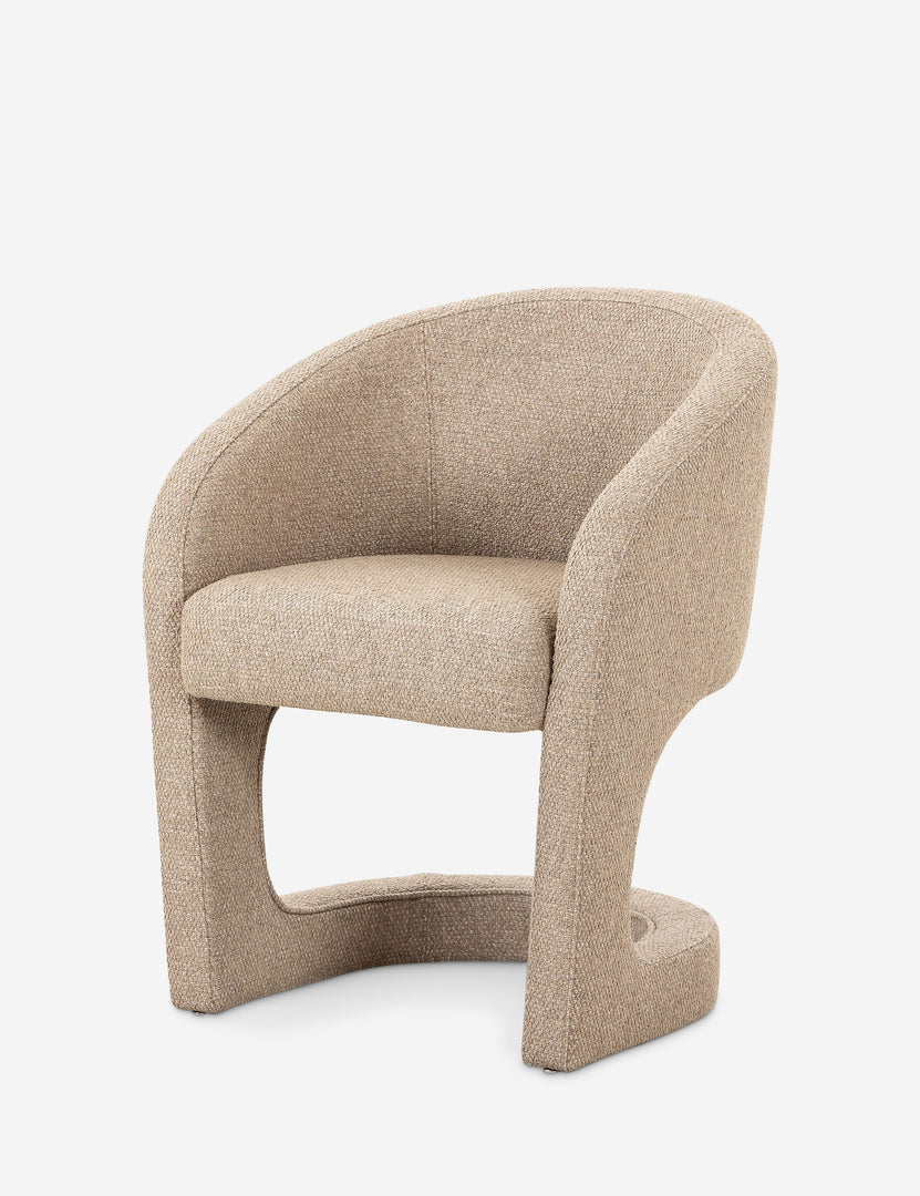 We love the sculpted, open base and barrel back of this modern dining chair. Perfect for comfort and style in a casually elevated space, this dining seat delivers impeccable comfort with textural upholstery in a neutral color to complement any setting.