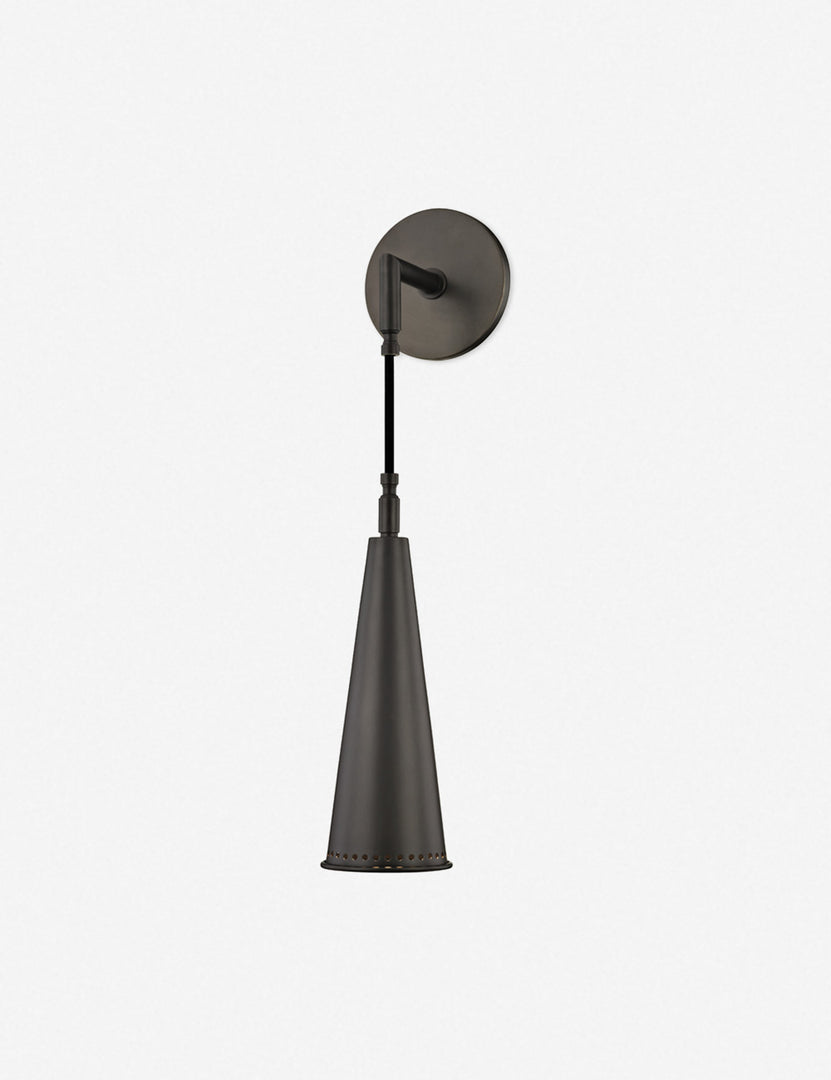 Blending classic touches in a modern design, this wall sconce gently elevates with warmth and polish. An L-shaped arm suspends a metal cone shade featuring a perforated rim, making this sconce perfect for tone-setting downlight in a curated aesthetic.