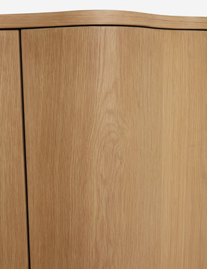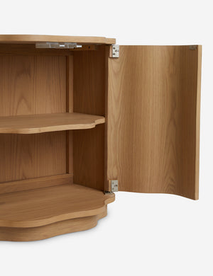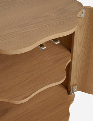 Celebrated for their ceramics and bold designs, Lolly Lolly Ceramics brings their knack for sophistication with a playful edge to an exclusive collection for your entire home. The Cora nightstand offers a striking play of shape with its half-moon design and scalloped front that opens to spacious interior storage. A light wood finish grounds this modern nightstand in natural grain warmth, perfect for a tailored bedside feel.