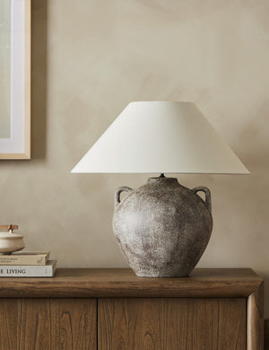 Inspired by the rustic artistry of antique clay jars, the Coralyn table lamp offers an earthy, grounded look. A rounded body with decorative handles is fashioned from Talavera and topped with a tapered linen shade fashioning this lamp for versatile appeal from the entryway to the lounge.