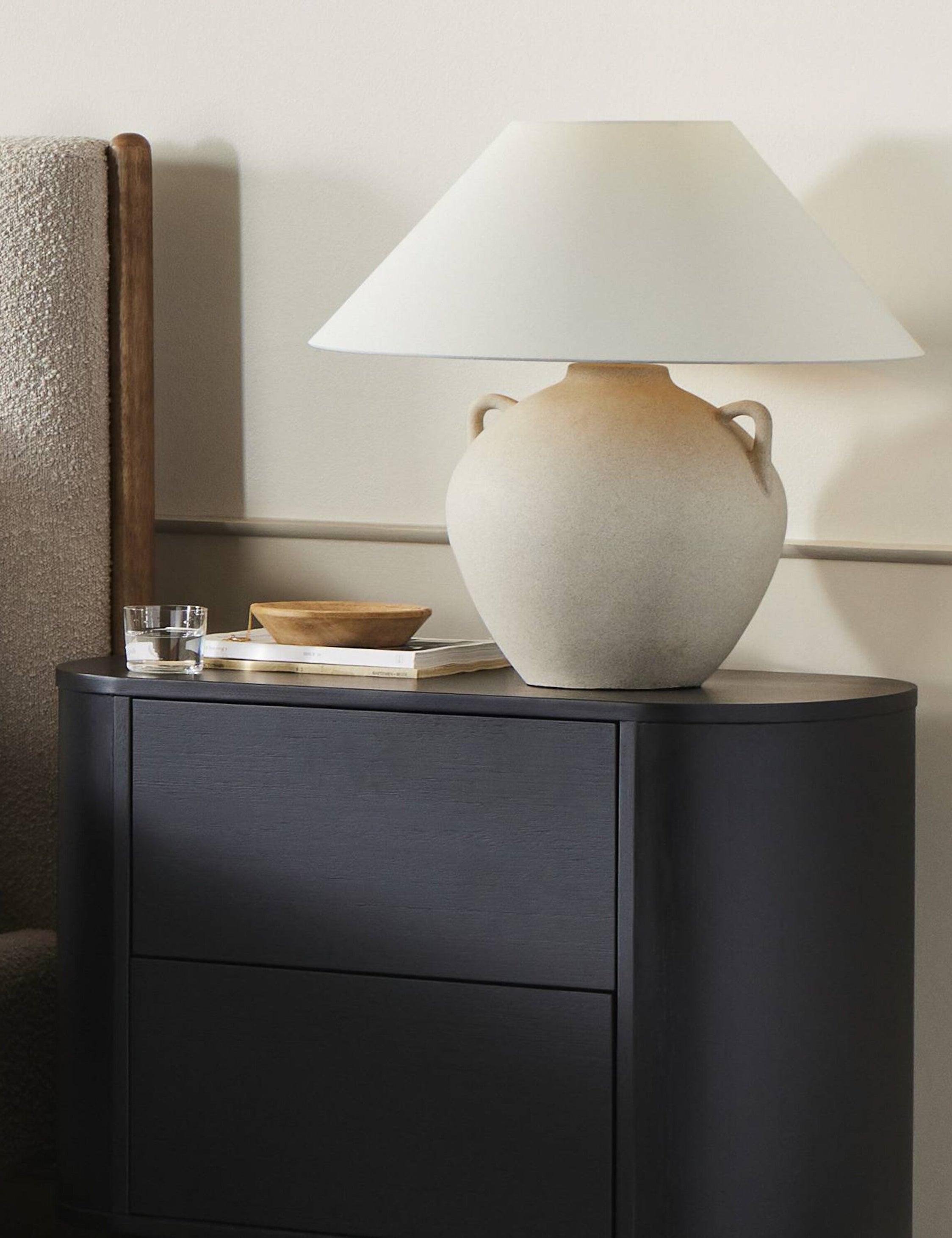 Inspired by the rustic artistry of antique clay jars, the Coralyn table lamp offers an earthy, grounded look. A rounded body with decorative handles is fashioned from Talavera and topped with a tapered linen shade fashioning this lamp for versatile appeal from the entryway to the lounge.