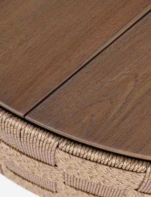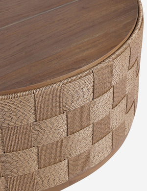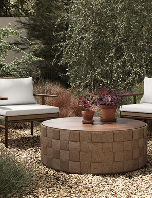 The Corsica coffee table anchors your outdoor lounge with bold texture. Featuring a woven base in chunky all-weather wicker and an inset teak top, this wood coffee table layers warmth into patios and open-air lounges.