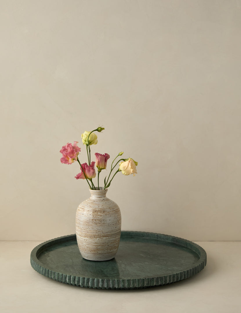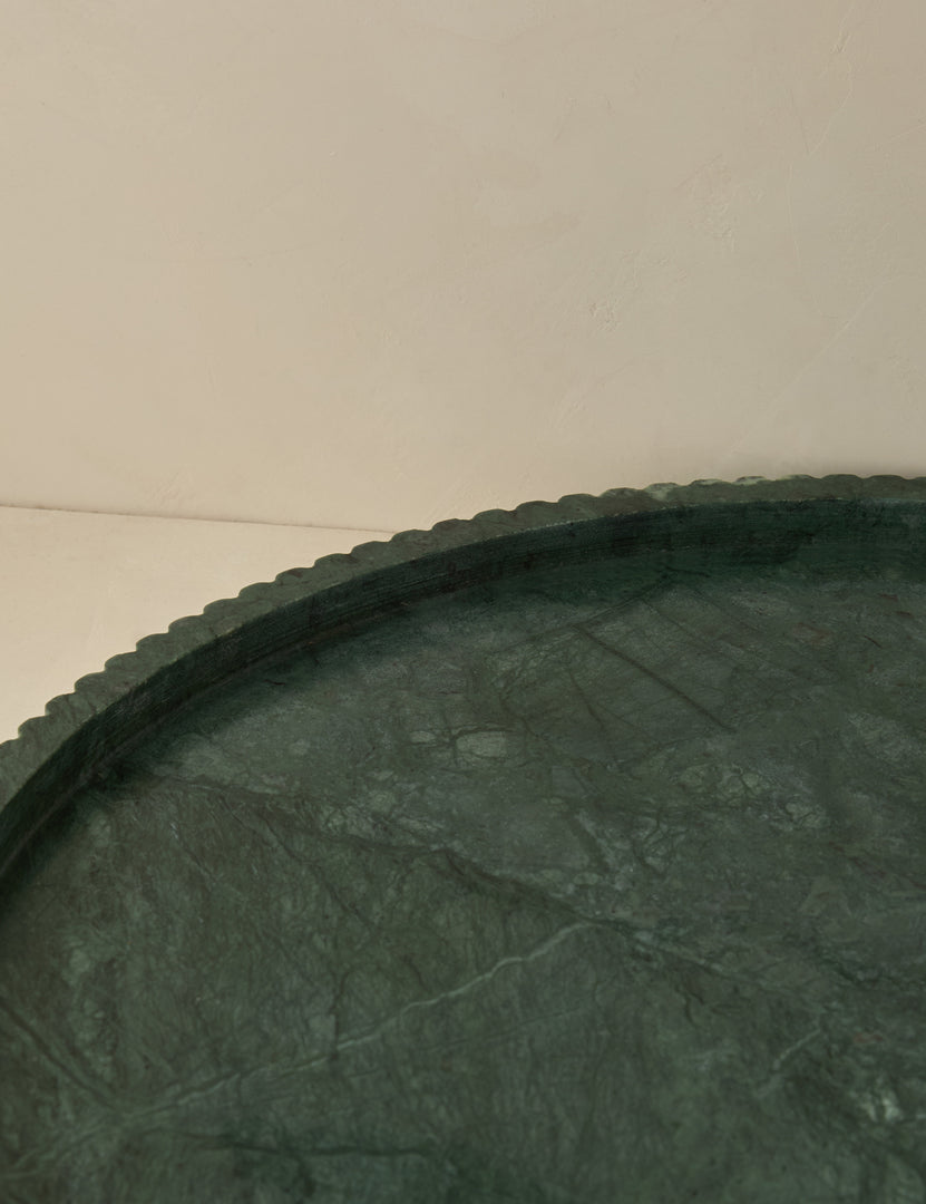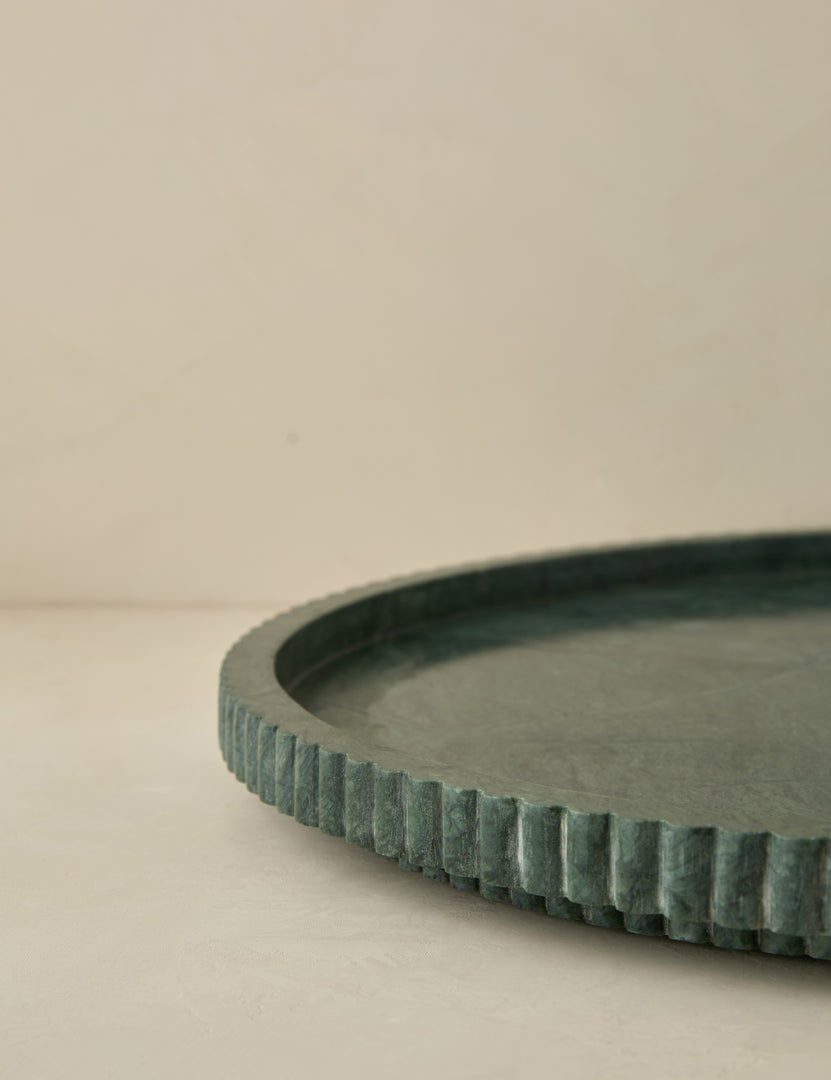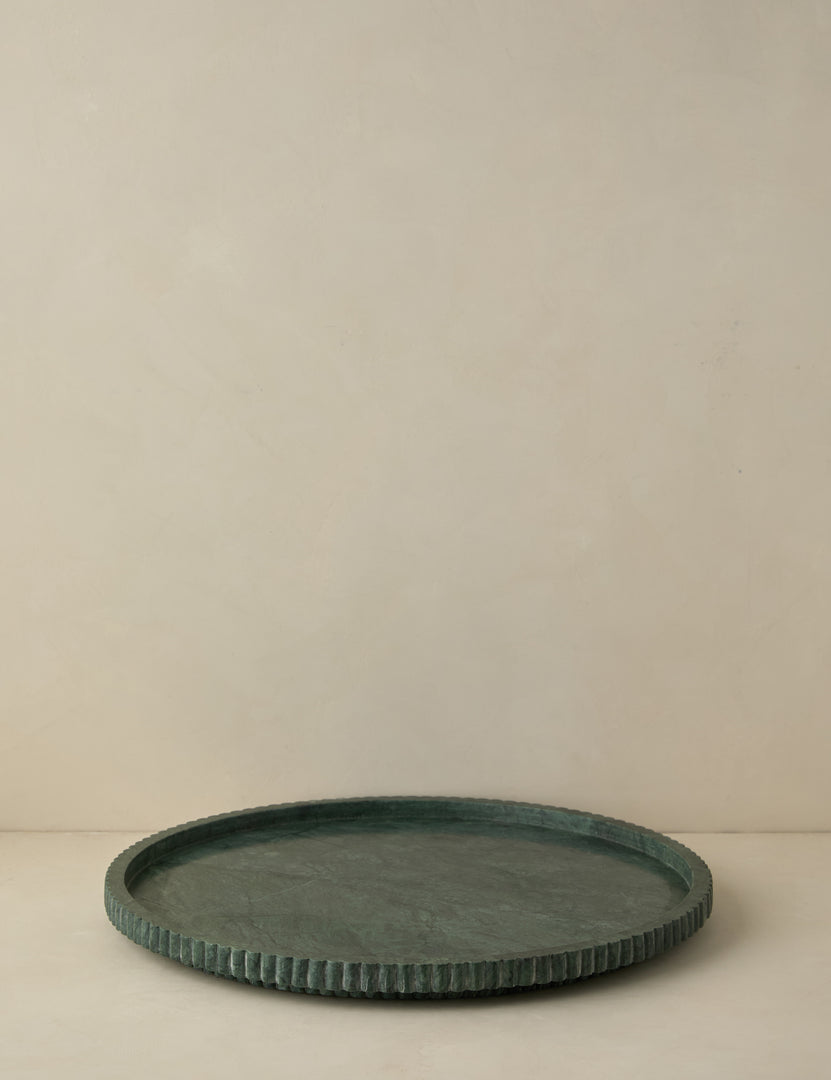 This round marble tray brings a touch of luxury to any tabletop. The plinth base and fluted sides add dimension to the polished green stone—creating an elegant accent that's understated yet impactful.