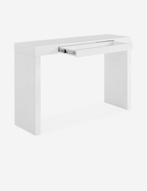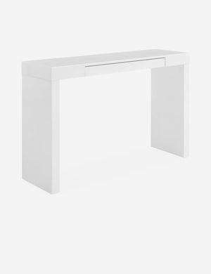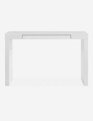 Created with workspace bliss in mind, this streamlined desk features a waterfall silhouette with a center drawer for convenient storage. We love this white desk for a minimalist home office look that feels bright, airy, and modern. With its slim top, this chic design can even style as a sleek console table.