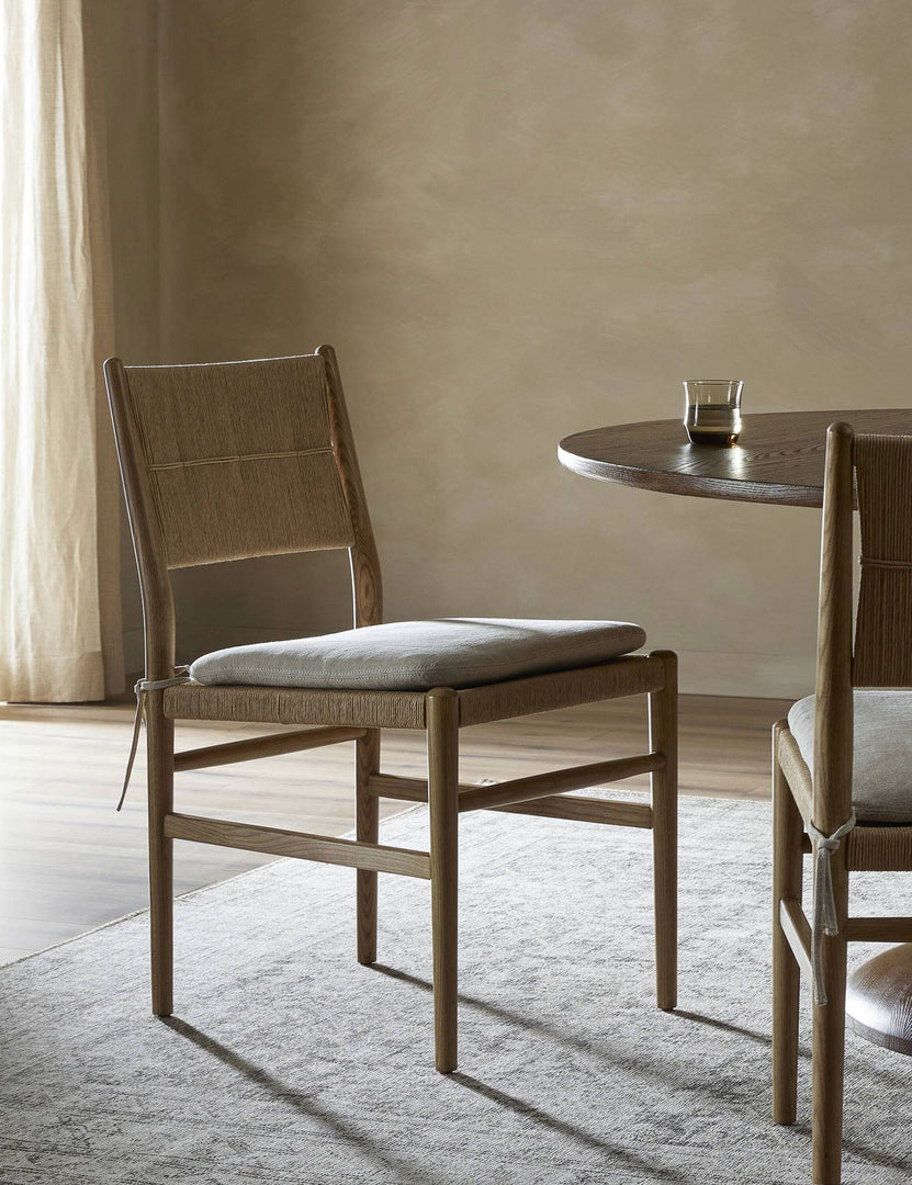 Four Hands brings their exceptional craftsmanship to a timeless collection rooted in Amber Lewis' perennial California style. Wrapped cording and a removable seat cushion team up to provide both exquisite style and impeccable comfort for a modern dining chair. The kitchen chair is an armless silhouette with a natural wood frame, offering a fresh, coastal design influence to a casual dining space.