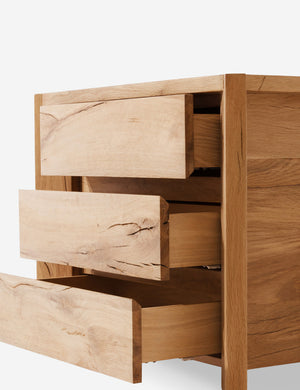 Angular legs and exposed joinery add rich character to this wood nightstand. With three drawers for easy storage and a natural finish, this modern nightstand design is grounded yet refined.