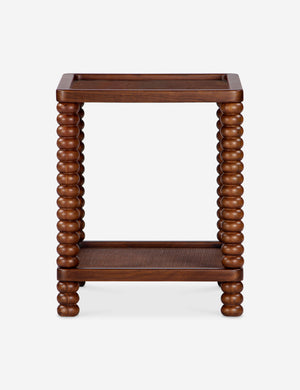 Turned wood legs define the look of the Dowd side table. The detail of the craftsmanship and rich finish evoke a timeless feel that folds rustic warmth into modern decor. With its cane shelf, this end table brings an attractive blend of style and surface space to any living room or bedside.
