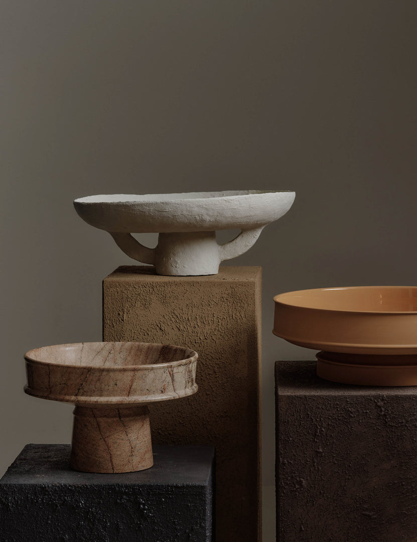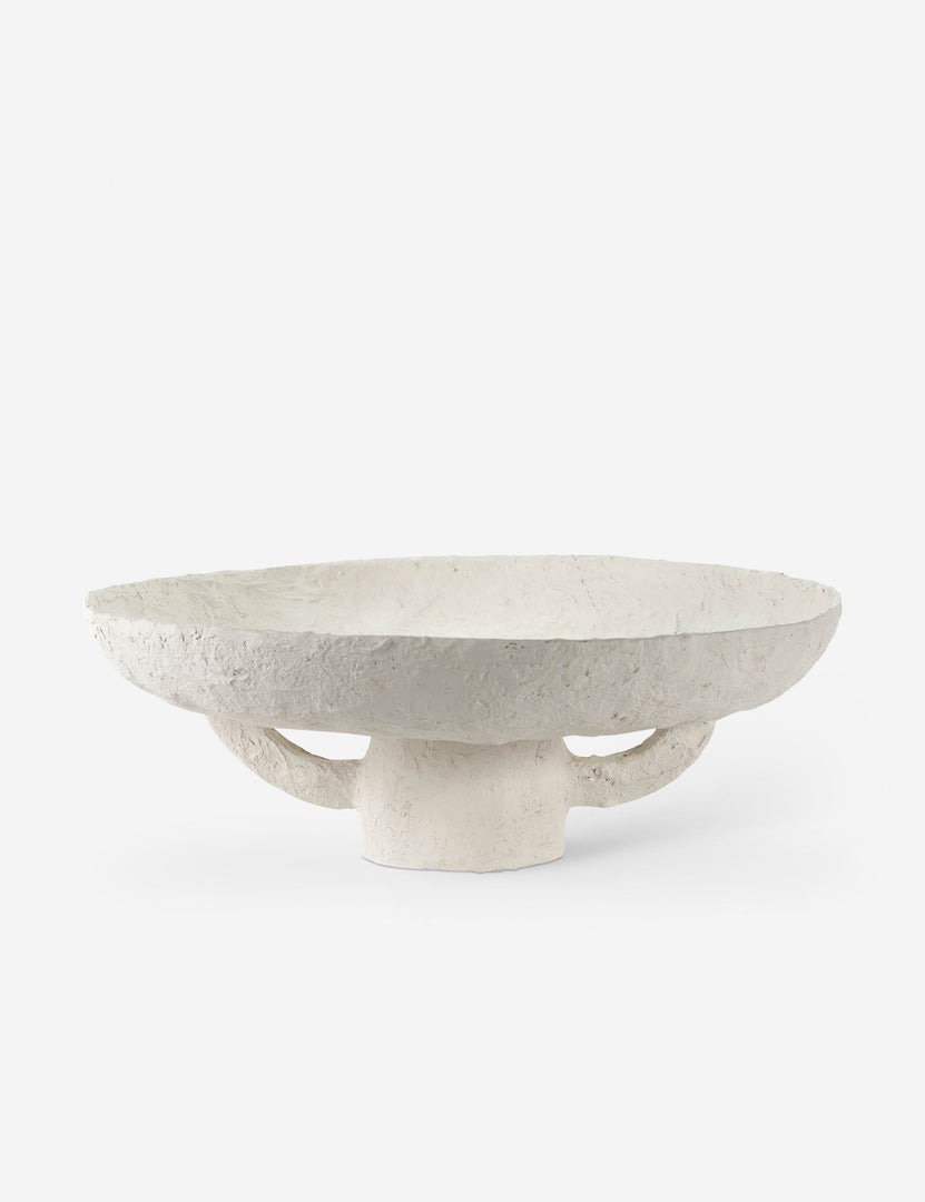 This paper mache pedestal plate brings sculptural impact to any surface with its wide, shallow form and bold, double-handled base. The hand-shaped design and textural finish lend an earthy feel, offering an artful accent whether styled solo or layered into a larger vignette.