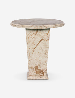 Rich veins create a warm contrast in the taupe marble featured in this modern side table. Its round top is paired with a tapered block base and stepped foot, creating a classic silhouette for refined decor. Add this end table to an entryway or living room as a sculptural statement piece.