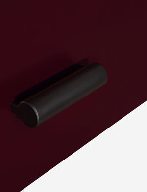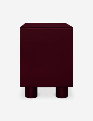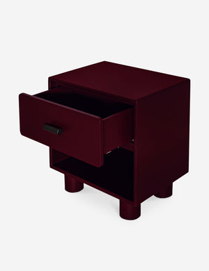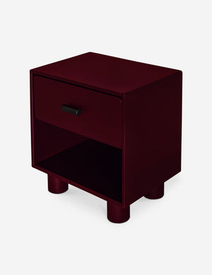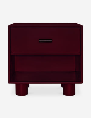 The Evrard nightstand brings bold color to clean lines for streamlined bedroom storage. The compact design features a soft-close drawer, open shelf, and rounded legs that add a sculptural touch to its pared-down silhouette. With its rich finish, this small nightstand can add depth to a moody bedroom or provide contrast in a neutral palette.