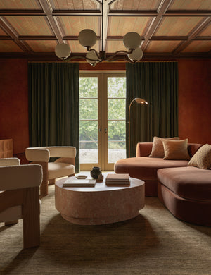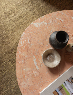 Our Faas coffee table makes a modern statement with an organic silhouette defined by clean lines and a lightly polished marble top. Rich veining creates a sense of movement, styling an elevated anchor for richly layered spaces. With its generous scale and low profile, this large coffee table offers a grounding centerpiece in any seating arrangement.
