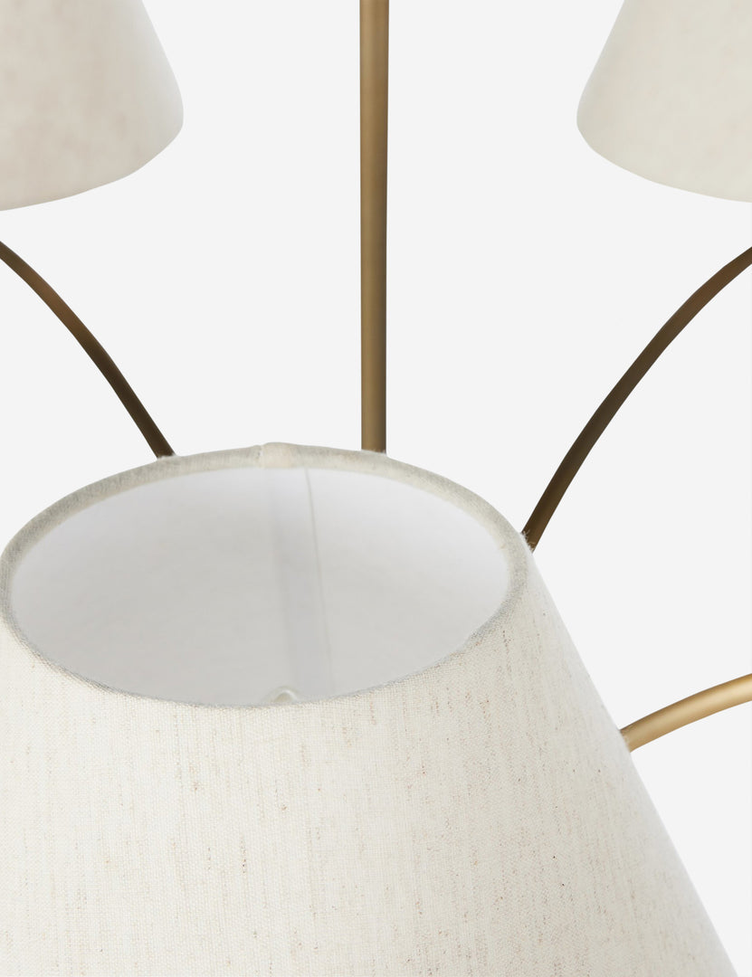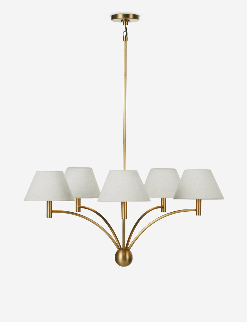 The Fanning chandelier cuts an elegant silhouette overhead with curved arms and central ball detail. The classic lines of the frame are topped with low tapered shades for transitional appeal. This versatile chandelier design can be mounted on slanted ceilings or as a flush mount fixture.