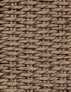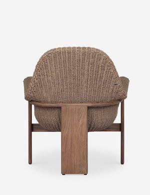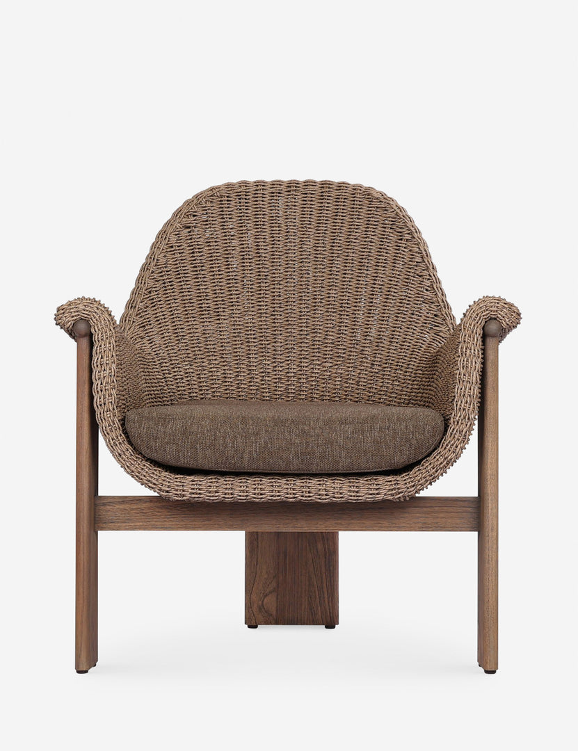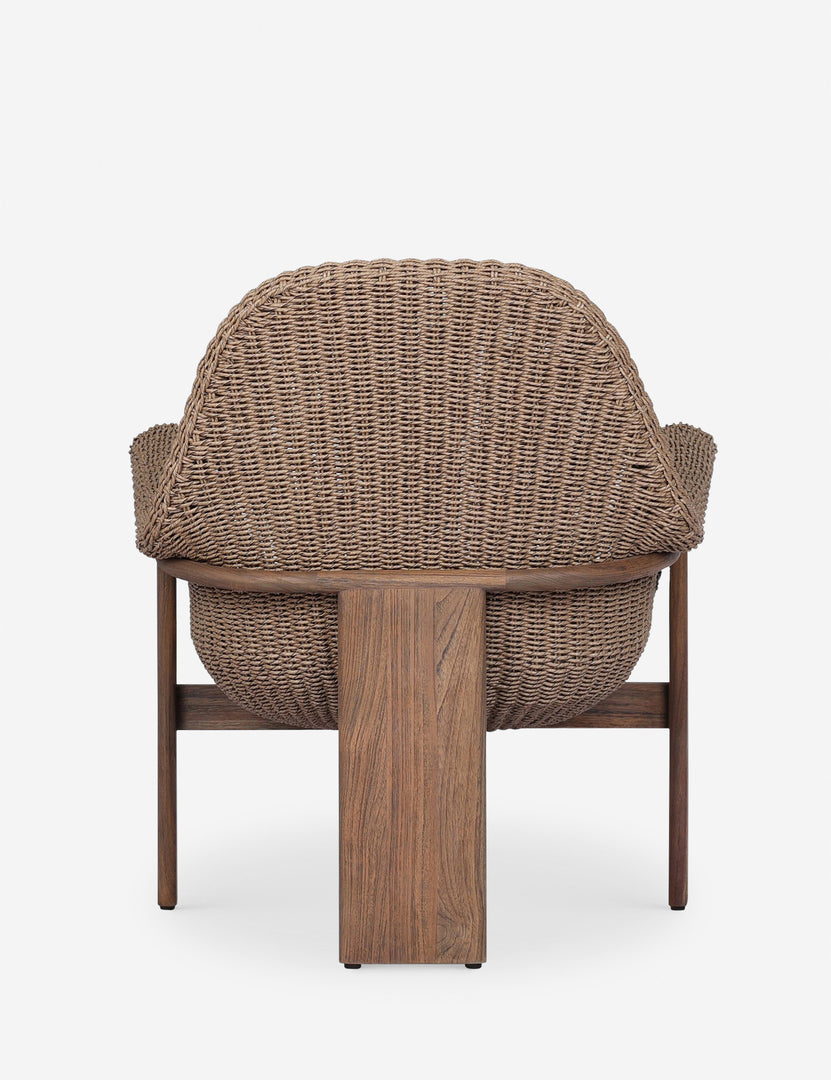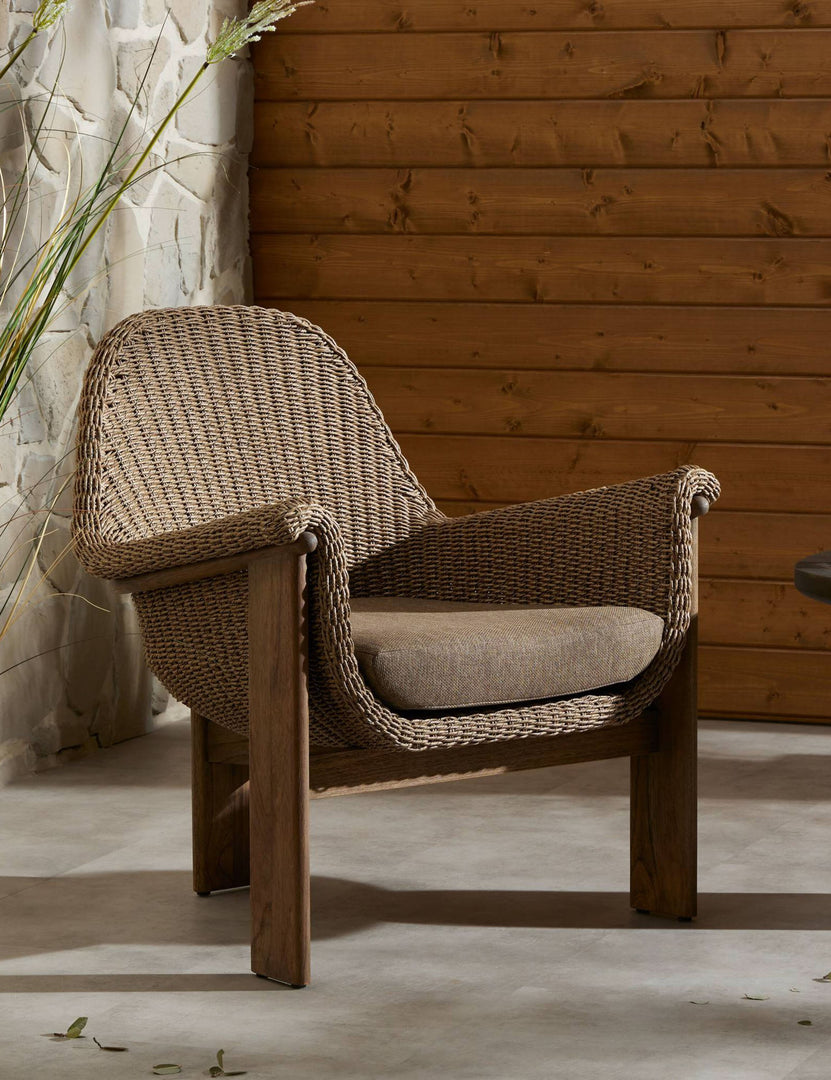 With its sculptural teak frame and rolled arms, this outdoor accent chair strikes the perfect balance of softness and strength. Handwoven fibers wrap the chair's curved seat in rich texture, while three legs strike a pared-back, architectural feel.