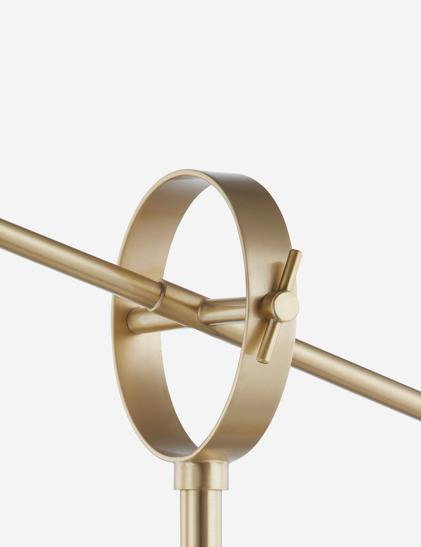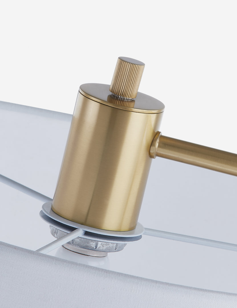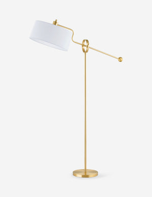 The Faustina floor lamp features a dynamic design poised for elegance. A central hinge lets you adjust the height, offering a useful task lamp or ambient illumination in the room. Its slim frame is finished in antique brass and topped with a white drum shade for stylish versatility.