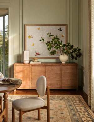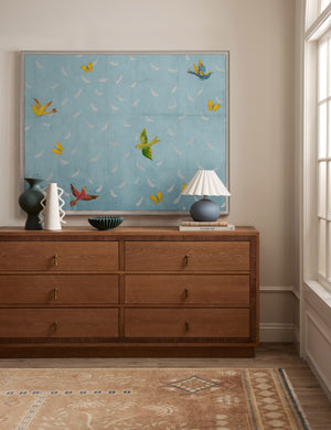 Elevate your wall decor with the iconic work of textile artist, engraver, and painter Paule Marrot. Each print captures her simple, lyrical style with boldness and fidelity—offering wall art with a fresh yet enduring appeal. Colorful birds amidst a scatter of feathers bring a delicate charm to this minimalist composition.